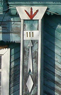 Дом 111 большой на четыре окна с узорчатым резным фронтоном.