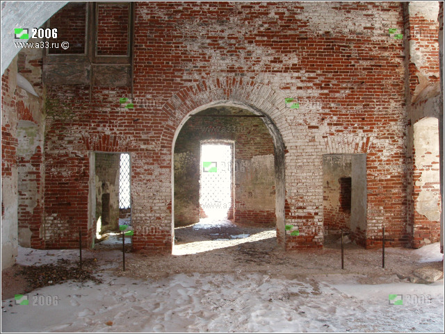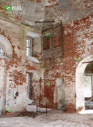 Интерьер основного объема церкви Покрова Пресвятой Богородицы в урочище Покров Гусь-Хрустального района Владимирской области. Вид в интерьере на запад. |