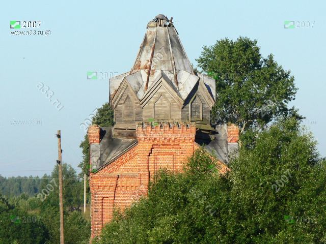 Нарушенное шатровое покрытие Петропавловской часовни в деревне Кудрино Киржачского района Владимирской области.