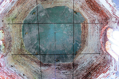 Кокошник восьмерика церкви Иоанна Предтечи в последней стадии деструкции лицевой кирпичной кладки, когда остатки кирпичей уже один за другим и целыми пластами падают вниз.