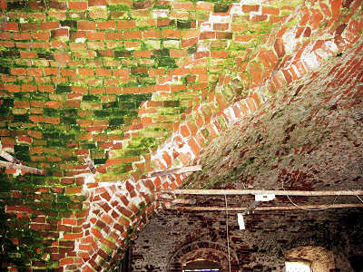 Своды трапезной Троицкой имели вывалы нижних слоёв кирпича вдоль шелыги; деревня Погребищи Судогодского района Владимирской области. |