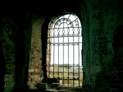 2004 Окно с коваными решётками в интерьере основного объёма церкви иконы Божией Матери Живоносный источник в селе Якиманское Суздальского района Владимирской области до ремонта.