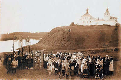 Крестный ход у села Якиманское под холмом с церквями иконы Богородицы Живоносный источник и Никольской в начале 20 века, источники архивного изображения: Боголюбский монастырь>>sobory.ru