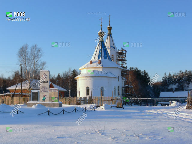 Панорама комплекса новой Смоленской церкви и памятника землякам погибшим в Великой Отечественной войне 1941-1945 годов на улице Шоссейной в посёлке станции Мстёра. |
