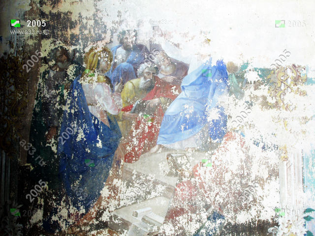 2005 Роспись над входным проёмом южной стены на билейский сюжет "Уверение апостола Фомы" в интерьере Борисоглебской церкви до ремонта; село Кубаево Юрьев-Польского района Владимирской области